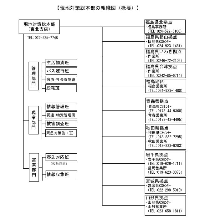 営業部門・・・客先対応班、情報収集班など - 東北支店管内各県(青森、秋田、岩手、山形、福島)の営業所または主要作業所に当該県を統括する対策本部を設置し、施工中の作業所被災状況の確認と、二次災害の発生防止を実施しました。