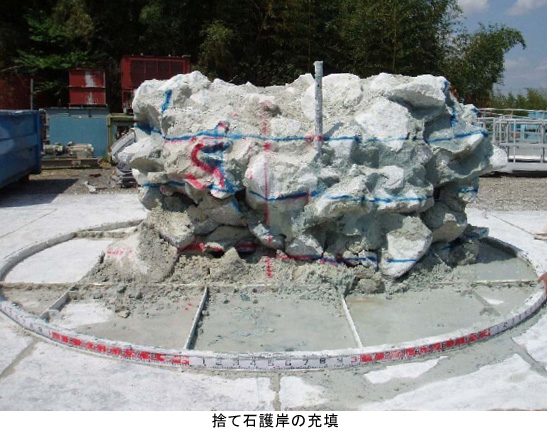 近年では捨石からなる護岸マウンドの間隙を充填して耐震補強を行う利用方法についても、実物の実験を行い、意図した範囲に充填できることを確認しています。