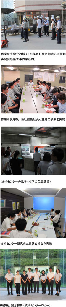 主な研修内容は、オンカジの概要やCSR活動の取り組み等の説明のほか、相模大野駅西側地区市街地再開発新築工事作業所(神奈川県)における「ものづくり」の現場を見学すること、また技術センター(横浜市)における建設技術の研究開発の現場を見学することです。各見学会では、こうした研修で得た体験を子供たちにどう伝えるかについて、作業所所員や技術センター研究員と意見交換(ダイアログ)を行い、有意義な3日間となりました。
