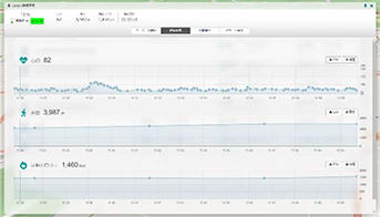 施設内外における患者の日々の心拍・活動量・歩数等の変化が生活習慣データとして可視化され、外来透析、通院リハビリ等による歩行機能などの定量的評価、運動療法による負荷測定や活動量の変化などを視覚的に確認できます。